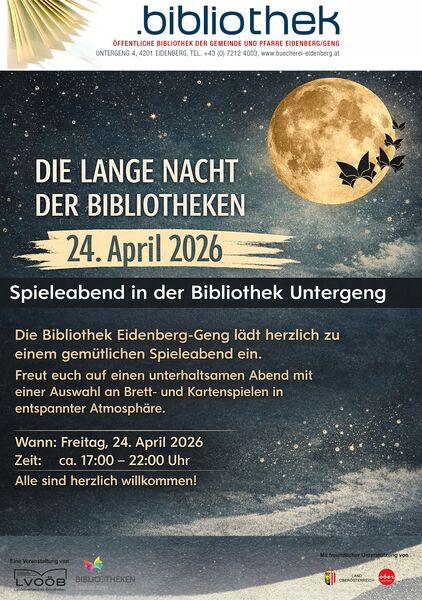 Die Bibliothek Eidenberg-Geng lädt herzlich zu einem gemütlichen Spieleabend ein.