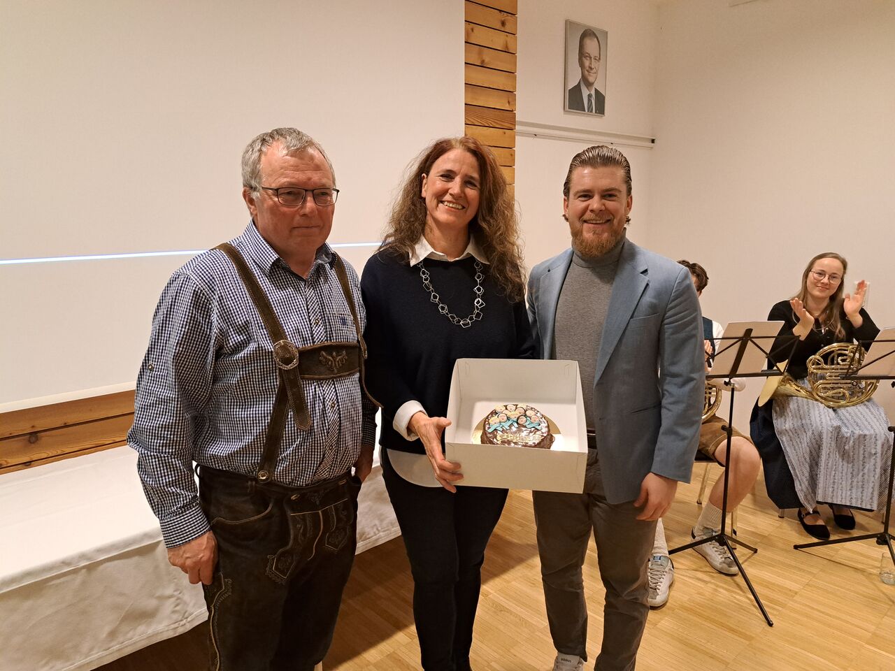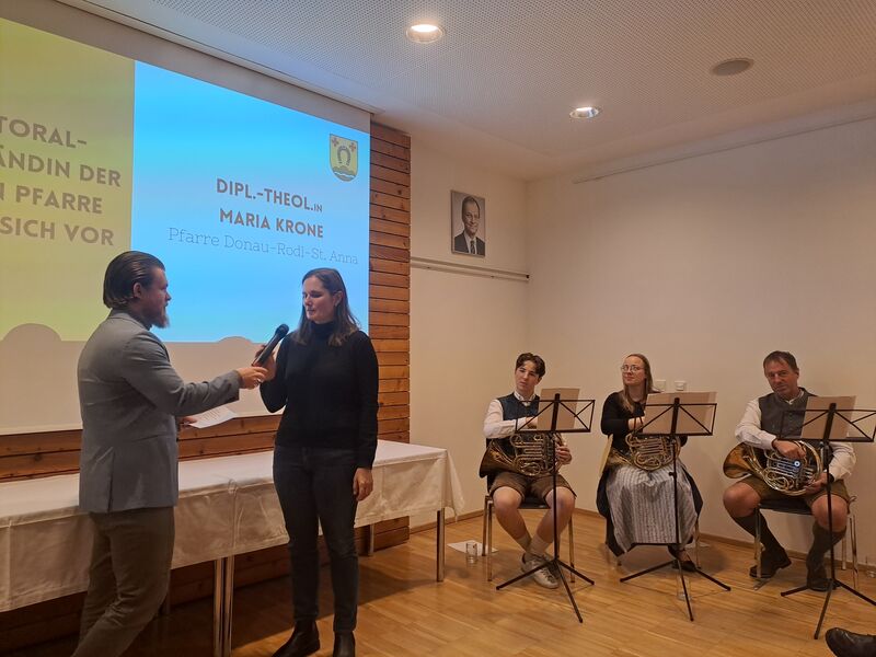Nach dem Sektempfang, gesponsert von der Raiffeisenbank, begrüßte Ausschussobmann Dominik Danner die zahlreichen Besucher sehr herzlich. Trotz vieler Absagen aufgrund Erkrankungen war der Gemeindesaal gut gefüllt. Im Mittelpunkt standen wie immer die vielen ehrenamtlichen Aktivitäten und Highlights des vergangenen Jahres. Nach dem Videorückblick der Feuerwehr Geng mit Abschnittswettbewerb und TLFB-Segnung berichtete MEGS 7 Obmann Josef Madlmeir über das erste halbe Jahr Abhollager. Besonders beeindruckend war das Video vom Kirchenchor Geng mit ihrem Auftritt im Petersdom und dem Chorkonzert zum Jahresende. Für ihr großartiges Engagement überreichte der Bürgermeister der Chorleiterin Maria Burgstaller eine Torte vom Cafe Laura. Vorstellen durfte sich heuer Pastoralvorständin Maria Krone von unserer neuen großen Pfarre „Rodl – Donau – St. Anna“. Bürgermeister Adi Hinterhölzl machte wie immer den Abschluss mit dem Jahresrückblick in Gedichtform. Musikalisch umrahmt wurde der Neujahrsempfang von 3 Musikern vom MV Eidenberg. Unsere Biobauern sorgten wieder für das kulinarische Wohl.